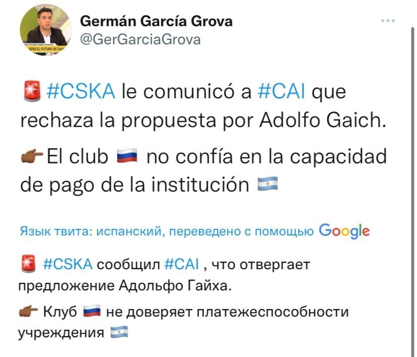 ЦСКА - Онлайн / Герман Гарсия Грова сообщает, что ЦСКА отклонил предложение аргентинского клуба