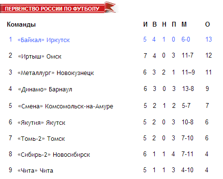Достаточно интересно выглядит таблица зоны "Восток" второго дивизиона. Иркутский "Байкал" идет на первом месте без единого поражения, без единого пропущенного мяча и с запасом в две игры от "Читы" и с игрой в запасе от "Металлурга", которые являются ближайшими преследователями команды Александра Алферова. Это впечатляет!