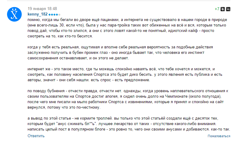 Я бы даже пошел еще дальше и дал бы право комментировать только платным пользователям. Это моментально бы отсеяло всех этих школоло с их ботами. Люди бы стали думать, прежде чем что-то написать. Если бы человек писал, что "Пеналду - гей", я бы предположил, что, видимо, Роналду как-то очень ... Читать дальше сильно обидел этого пользователя, что тот аж заплатил денег, чтобы выразить свой крик негодования. Что он не поленился, устроился на работу, заработал денег и оставил свой комментарий. Черт возьми, Роналду нанес непоправимую травму его психике, раз человек согласился на такой ход событий)))