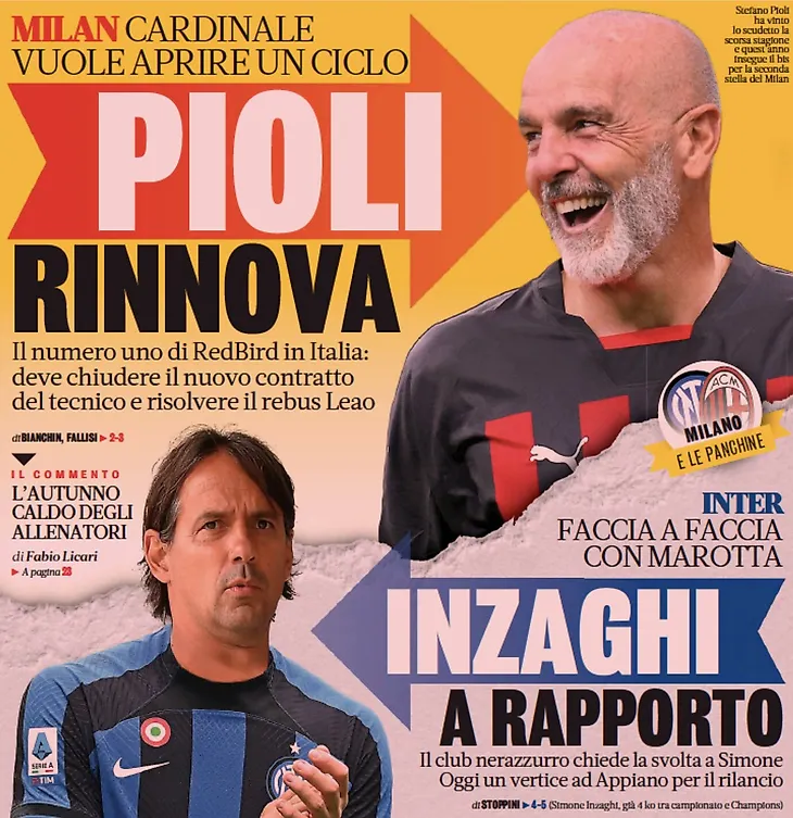 Пиоли продлевает, Индзаги докладывает. Заголовки Gazzetta, TuttoSport и Corriere за 22 сентября