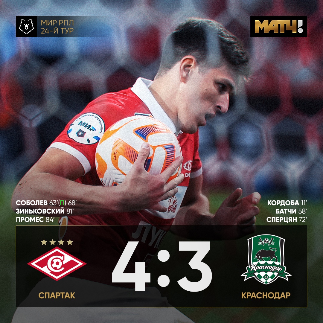 «Спартак» дома обыграл «Краснодар» в матче 24-го тура чемпионата России — 4:3.