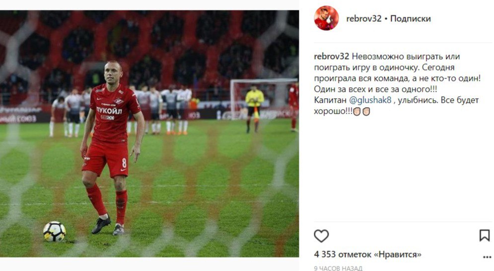 «Невозможно выиграть или поиграть игру в одиночку. Сегодня проиграла вся команда, а не кто-то один! Один за всех и все за одного!!! Капитан @glushak8, улыбнись. Все будет хорошо!!!»