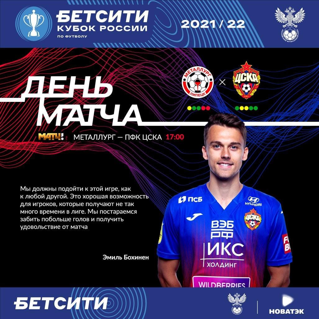 Полузащитник ЦСКА Эмиль Бохинен поделился ожиданиями от матча БЕТСИТИ Кубка России против липецкого «Металлурга».