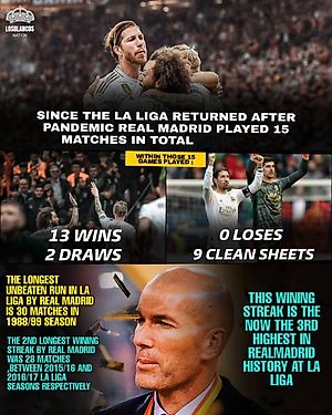 Безпроигрышная серия #Реал Мадрида в #Ла Лига, на сегодняшний день, составляет 15 матчей (13 побед, 2 ничьих, 9 «сухарей») — это третий результат в истории Клуба.