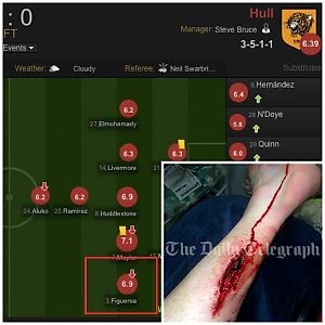 В рубрике худший судья побеждает рефери матча #Сток Сити - #Халл. #Мэйнор Фигероа сфолил на #Стивен Айрленд и отделался лишь устным внушением судьи. А теперь посмотрите, что случилось с ногой Стивена. А еще говорят, что у нас судьи плохие.