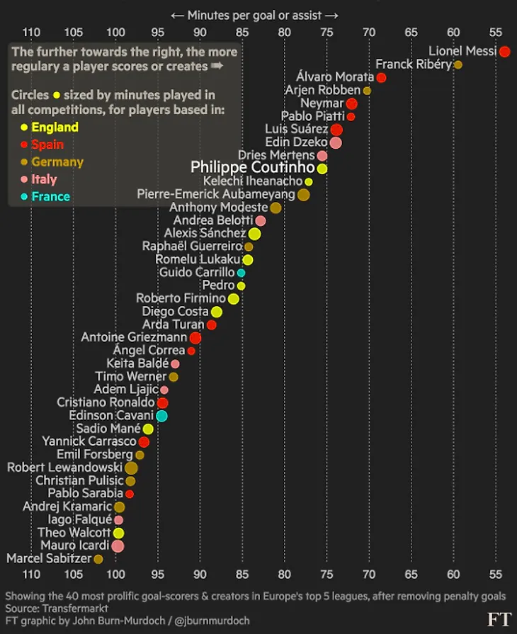 Размер кружка говорит о количестве сыгранных минут. Соответственно, чем больше минут сыграно, тем сложнее придерживаться высокой результативности. На графие отображены 40 самых результативных нападающих топ 5 лиг без учёта голов с 11-метровой отметки. Источник - Transfermarkt.