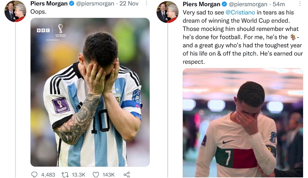 Гаспачо / 🤨 Такой разный Пирс Морган... В Твиттере обсуждают реакцию журналиста на провальный старт Месси и вылет Роналду