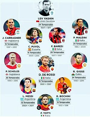 #Лев Яшин #Джейми Каррагер #Карлес Пуйоль #Франко Барези #Паоло Мальдини #Пол Скоулз #Даниэле де Росси #Райан Гиггз #Рикардо Бочини #Франческо Тотти