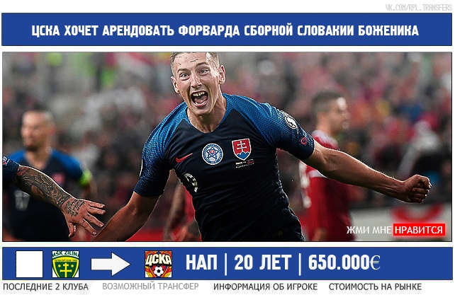 Мартин Петраш, представитель агентства, которое ведёт дела форварда «Жилины» и сборной Словакии Роберта Боженика, сообщил, что московский ЦСКА сделал предложение по его клиенту.