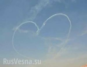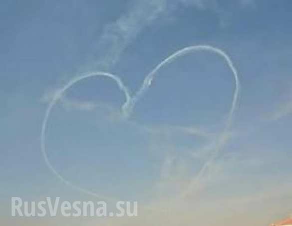 На фотографиях видны следы в небе — это сердца, которыми летчики ВКС России поздравили сирийцев в День святого Валентина.