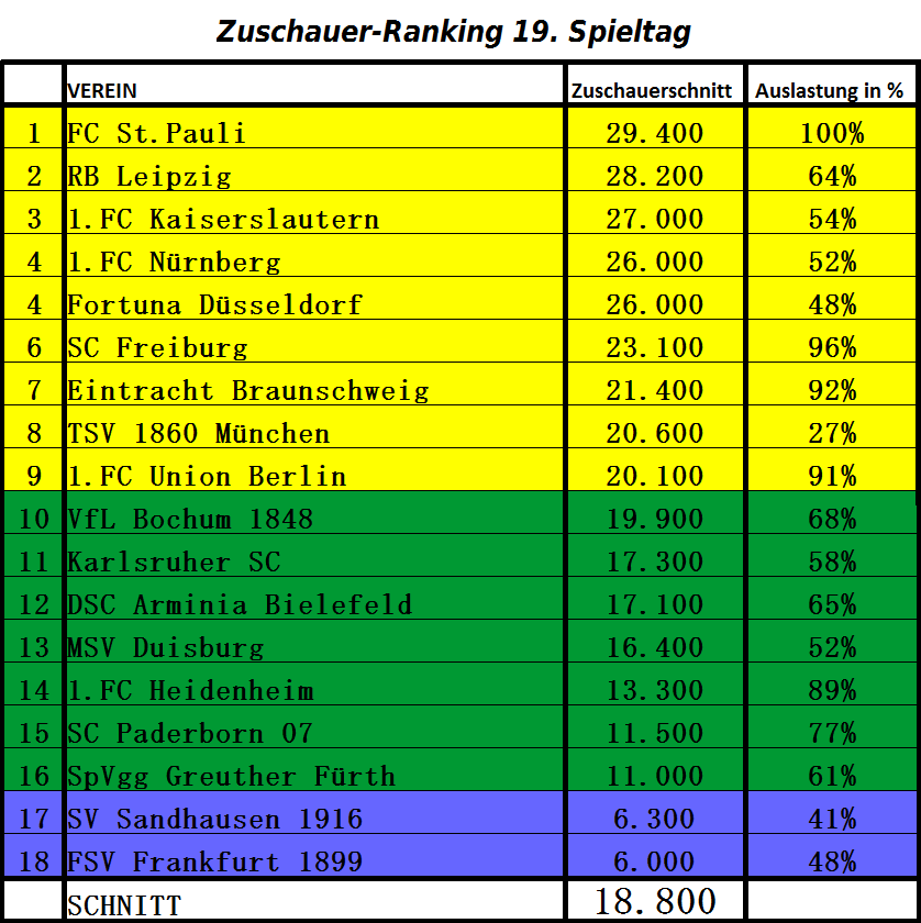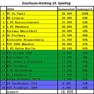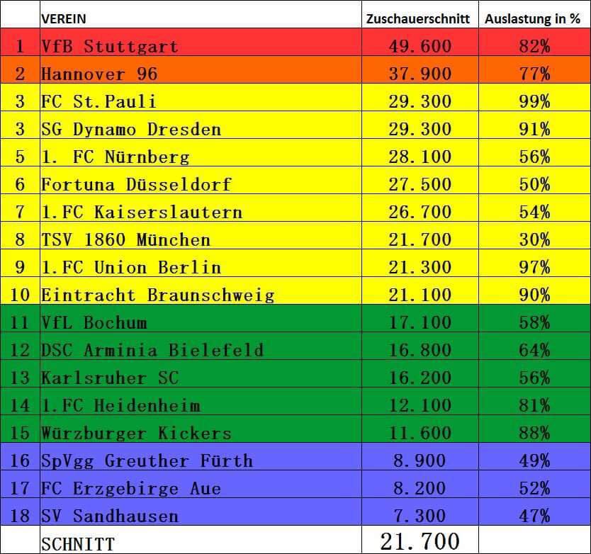 Таблица посещаемости домашних матчей Второй Бундеслиги. У “Санкт-Паули” посещаемость равна числу мест на “Миллернторе”. Будь арена вместительнее, вполне могли и “Штутгарт” с “Ганновером” догнать. Видимо, в ближайшие годы опять встанет вопрос расширения стадиона или строительства новой арены.