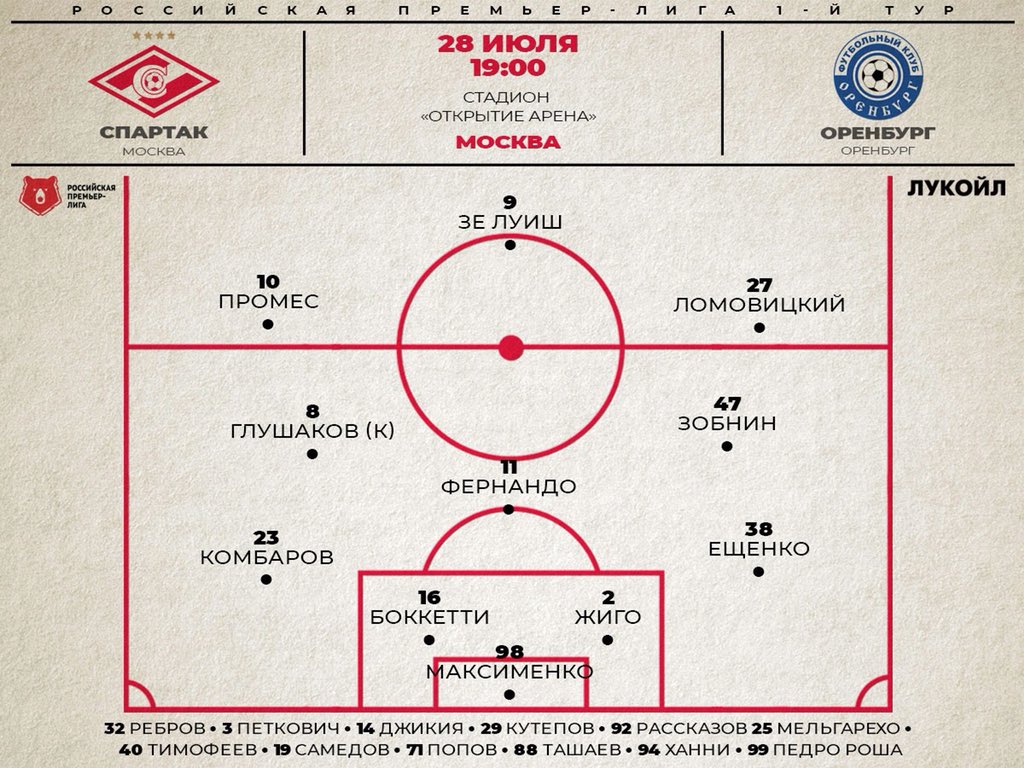 Спартак Онлайн / Состав «Спартака» в матча с «Оренбургом»