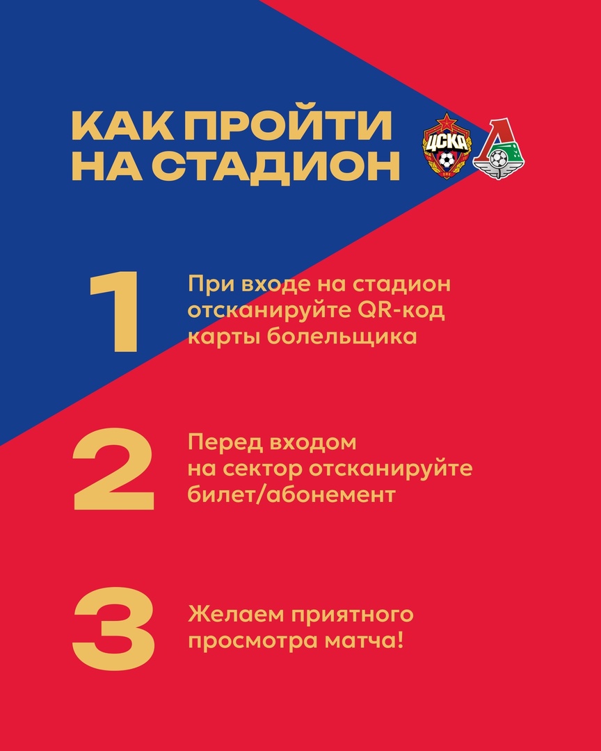 ЦСКА - Онлайн / Напоминаем, что для прохода на стадион на матч с «Локомотивом» вам понадобится билет или абонемент, а также QR-код вашей