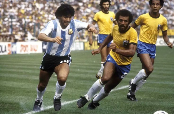 1982г. БРАЗИЛИЯ - АРГЕНТИНА. 21-летний МАРАДОНА в игре против Бразилии...(бразильцы, слева-напр: СОКРАТЕС, ЖУНИОР, Луизиньо). Очень многое тогда зависело от судей...но они, увы, промолчали, позволив, в 1982 г, "убить", возможно самую Великую Сборную в Истории Аргентинского футбола...