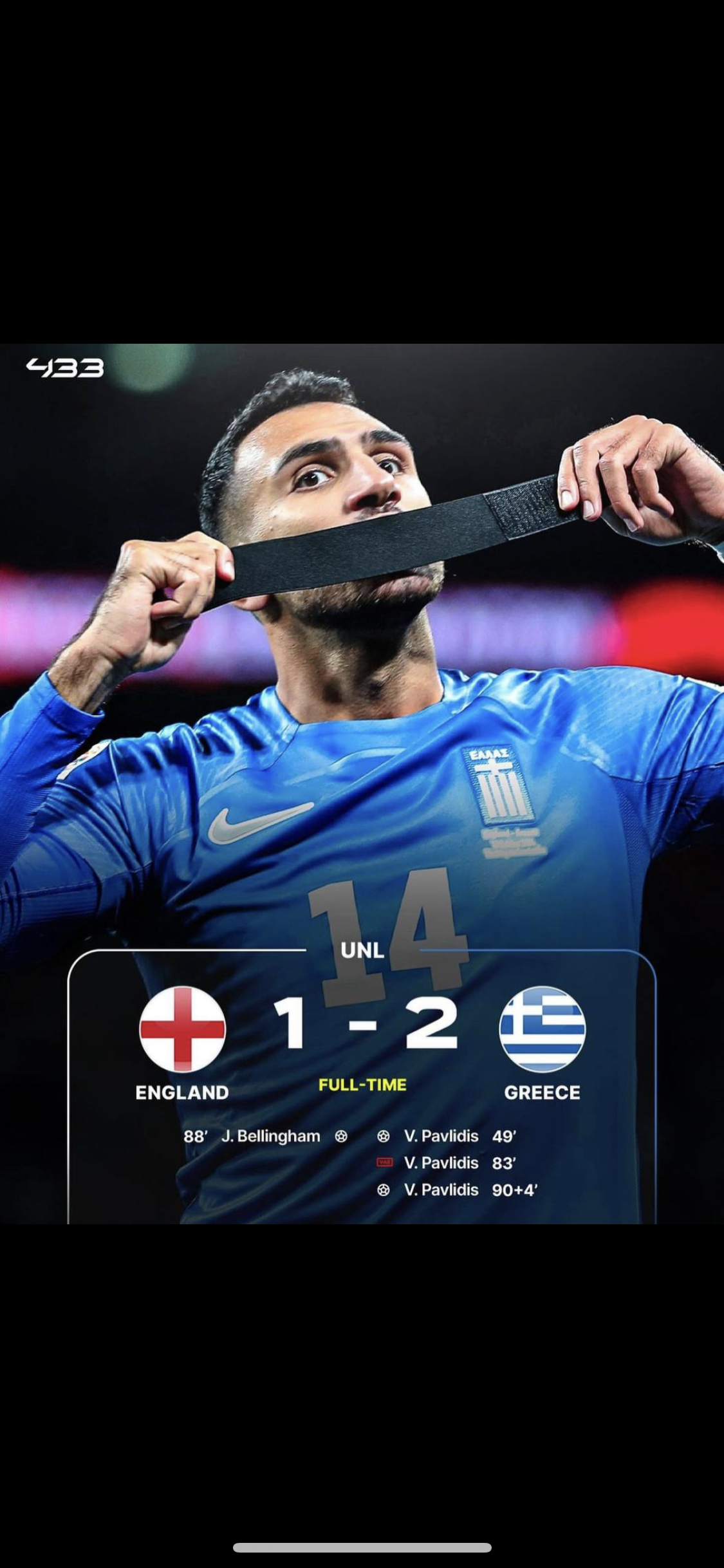 Англия уступила сборной Греции со счетом 2:1,не помог даже гол Беллингема который мог показаться уводит команды в ничью, но Греки смогли вырвать победу на последних минутах матча.