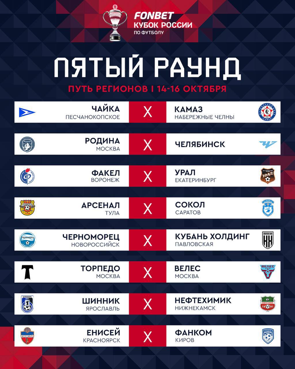 Пары пятого раунда FONBET Кубка России Пути регионов. Матчи пройдут с 14 по 16 октября