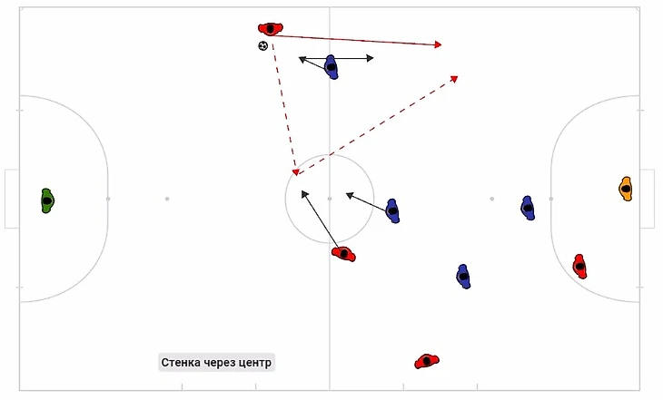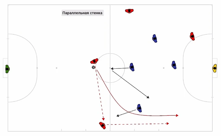Следующее взаимодействие вытекает из первого или может стать причиной неудачного расположения обороны. Хочу заметить, что нападающий игрок (находящийся ближе к вратарю соперника), должен вытянуть своего защитника на себя, чтобы освободить зону для взаимодействия.