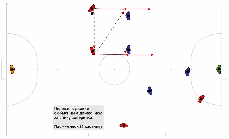 Бывает так, что соперник прессингует и плотно играет с каждым игроком. Опускаясь вниз красный игрок без мяча вытягивает защитника на себя и резко врывается в зону. Игрок с мячом держит мяч на "дальней" ноге и ждет подходящего момента для передачи.