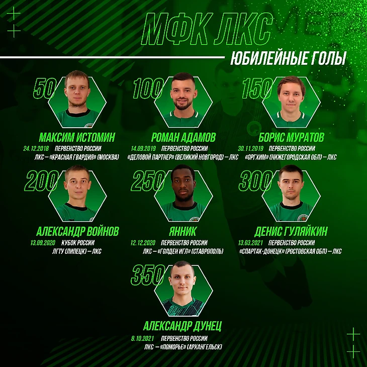 Юбилейные мячи МФК ЛКС 50-й – Максим Истомин, 24.12.2018, Первенство России, ЛКС – «Красная Гвардия» (Москва). 100-й – Роман Адамов, 14.09.2019, Первенство России, «Деловой Партнер» (Великий Новгород) – ЛКС. 150-й – Борис Муратов, 30.11.2019, Первенство России, «Оргхим» (Нижегородская область) – ЛКС. 200-й – Александр Войнов, 13.09.2020, Кубок России, ЛГТУ (Липецк) – ЛКС. 250-й – Янник Сомплей, 12.12.2020, Первенство России, ЛКС – "Голден Игл" (Ставрополь). 300-й – Денис Гуляйкин, 13.03.2021, Первенство России, "Спартак-Донецк" (Ростовская область) – ЛКС. 350-й – Александр Дунец, 08.10.2021, Первенство России, ЛКС – "Поморье" (Архангельская область). За предоставленные данные благодарим Михаила Ожегова.