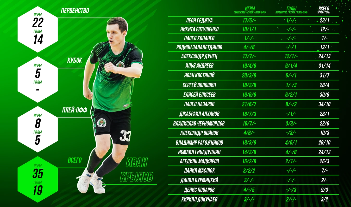 Больше всего голов Лучшим бомбардиром команды стал Иван Крылов, на его счету 19 голов. 14 раз ворота соперника поражал Илья Андреев, 13 забитых мячей у Александра Дунца.