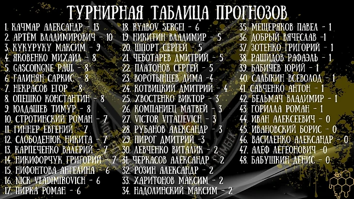 Свои обороты набирает и турнир прогнозов. Борьба идёт не шуточная и постепенно места распределяются. Но один точно угаданыый счёт может всё перевернуть💪