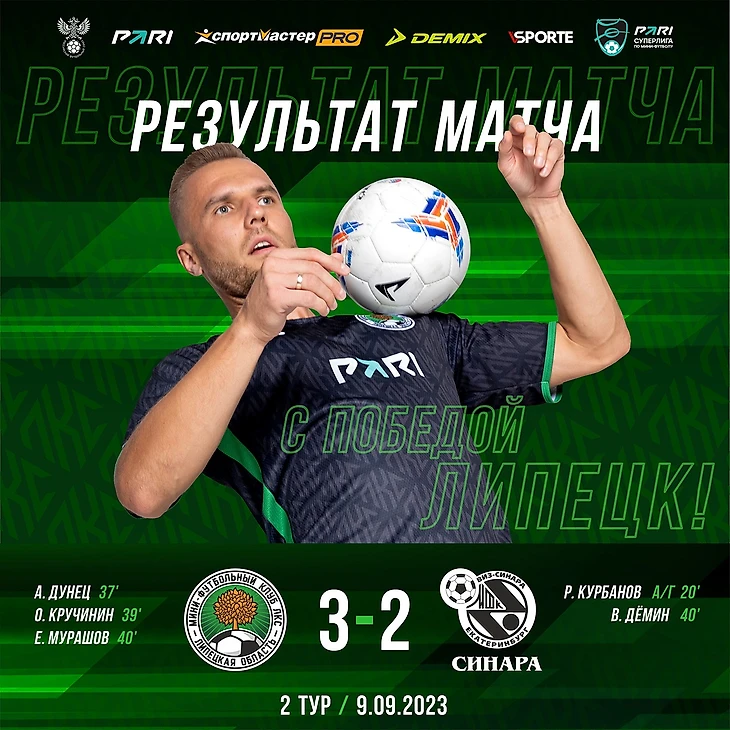 МФК ЛКС (Липецкая область) – МФК "Синара" (Екатеринбург) – 3:2 (0:1). PARI – Суперлига / Чемпионат России по мини-футболу среди мужских команд / сезон 2023/24, 2 тур, второй матч. 9 сентября 2023 года. УСК "Атлант" (Липецкий район, Копцевы Хутора, ул. Котовского, 1В). Голы: Руслан Курбанов (а/г) — 20 мин (0:1), Александр Дунец — 37 мин (1:1), Олег Кручинин — 39 мин (2:1), Евгений Мурашов — 40 мин (3:1), Валерий Дёмин – 40 мин (3:2). Предупреждения: Фидан Низамутдинов. Удаление: Исмаил Гибадуллин – 31 мин. Фолы: 1 тайм — 3/1, 2 тайм — 4/3.