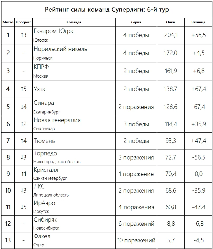 Богатый урожай баллов индекса силы по итогам тура собрали также «Тюмень» и «Новая генерация», подобравшись к топ-5. «ИрАэро» после двух домашних поражений скатился на 5 мест и теперь не попадает даже в десятку. А полный Рейтинг силы после 6-го тура выглядит так.