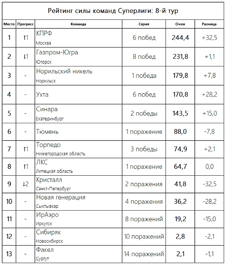 После 8-го тура позиции команд претерпели мало изменений. Лишь КПРФ и «Газпром-Югра» поменялись местами, «Кристалл» потерял два места, а «Торпедо» с «ЛКС» поднялись на одну ступень.