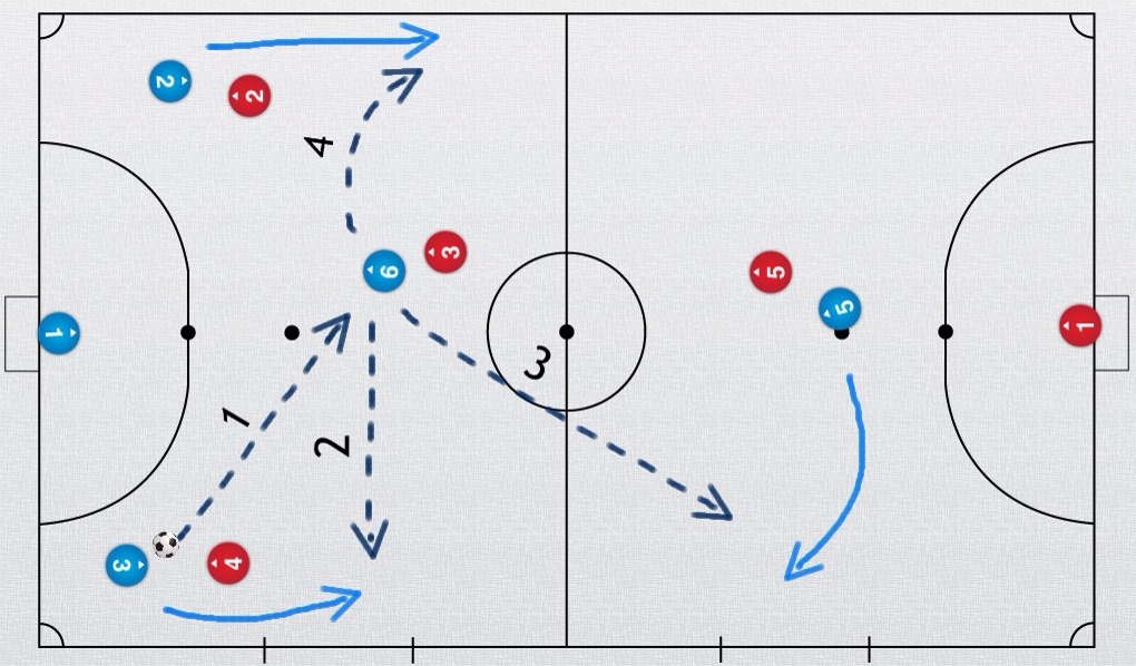 Игрок №3 после передачи смещается в центр под №6 или под стенку. Игрок № 2 в момент передачи мяча делает рывок по флангу. Игрок №6 так подрабатывает мяч в одно касание, чтобы можно было вторым (максимум третьим) отдать передачу на ход игроку №2. Игрок №5 в момент передачи уходит со своей позиции на правый фланг. За счет данной комбинации можно организовать выход 2х1.