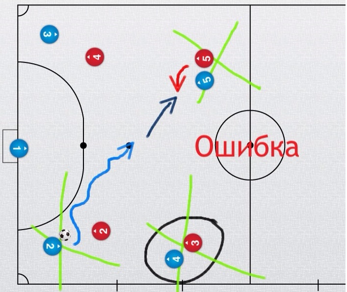 Игрок №5 у "синих" еще до приема мяча игроком №2 должен был опуститься ближе к вратарской зоне, чтобы увести за собой партнера и освободить зону для игрока №3. Тактически грамотный игрок данную ошибку допустить не должен. Стоит объяснить игроку, что следует делать в данном случае.