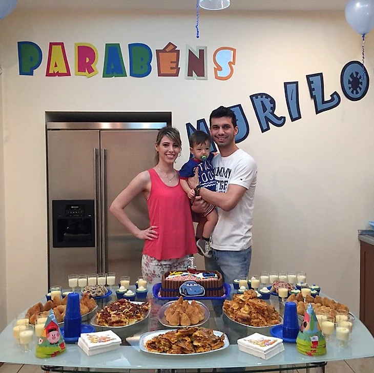 Недавно моему сыну Мурило исполнился год, мы устроили праздник. Все эти угощения делала моя жена и ее подруга. В самом низу – пирог из курицы. Чуть выше – пицца с колбасой, мне рассказывали, что у вас она называется «краковская». Правее – мусс из маракуйи и мусс из лимона, немного похоже на крема каталана, но не совсем то. По центру – шоколадный болу, то есть торт. Рядом – пирожки с сыром. Все это я очень, очень, очень люблю.