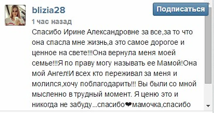 «Спасибо Ирине Александровне за все, за то, что она спасла мне жизнь, а это самое дорогое и ценное на свете. Она вернула меня моей семье. Я по праву могу называть ее мамой. Она мой ангел. И всех, кто переживал за меня и молился, хочу поблагодарить», – написала Близнюк в своем инстаграме.