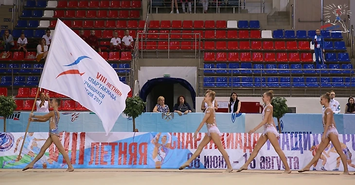 Пока же девушки доказывают своё мастерство на Спартакиаде. Каждой – от 13 до 15 лет. Соревнования продолжались три дня. 7 июня девушки познакомились с залом и провели контрольную тренировку. 8 числа – первые старты. Соревнования проходили в индивидуальном, групповом и командном многоборье. Первыми на ковёр вышли группы, в каждой по 6 человек. Девушки выступали со скакалками. Всего два потока и 21 коллектив. Затем настал черёд индивидуальных упражнений с обручем и мячом. Решающими стали соревнования 9 июня. Здесь девушки в командах демонстрировали свои умения с обручем и мячом, а в индивидуальном многоборье –состязались с булавами и лентами.