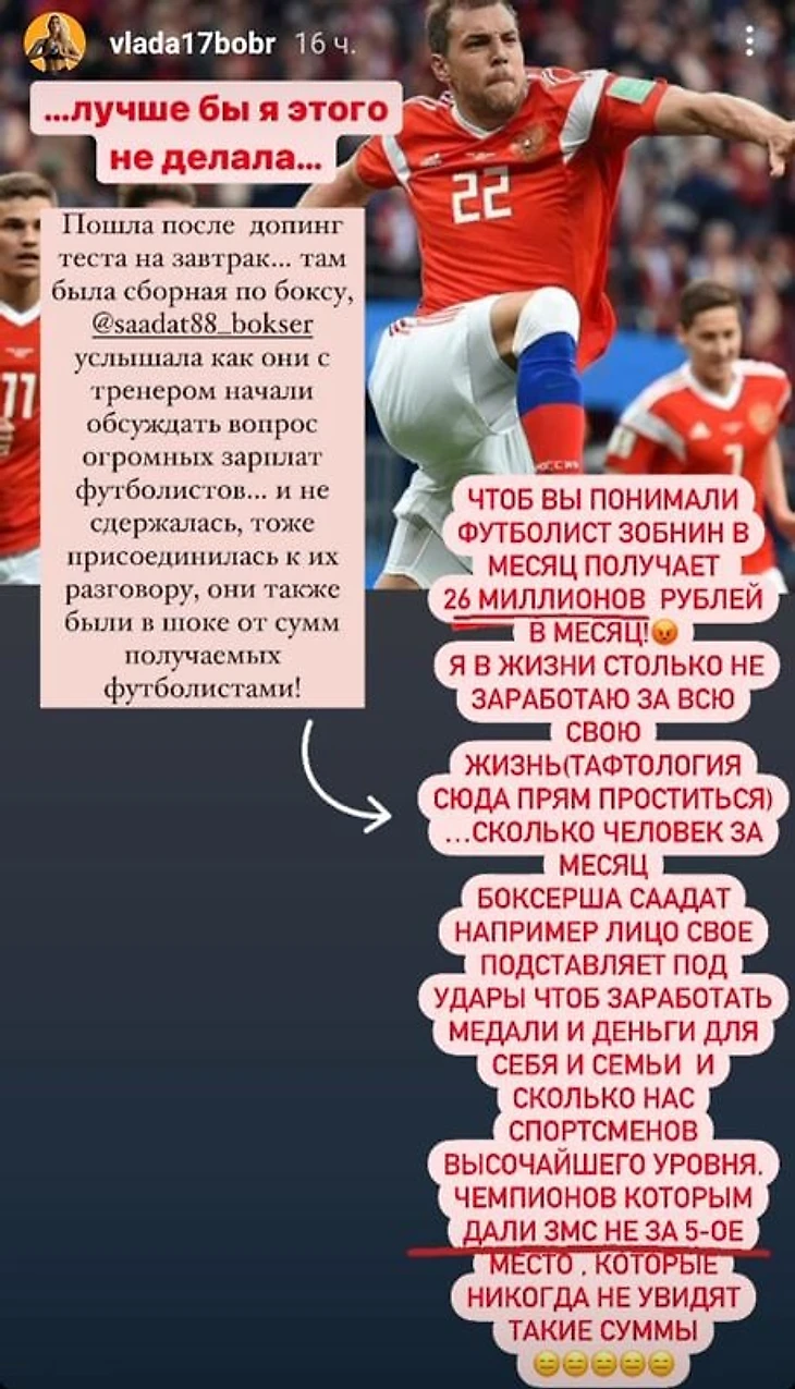 «Пошла после допинг-теста на завтрак... Там была сборная по боксу. Услышала, как Саадат Далгатова с тренером начали обсуждать вопрос огромных зарплат футболистов... И не сдержалась, тоже присоединилась к их разговору. Они также были в шоке от сумм, получаемых футболистами!