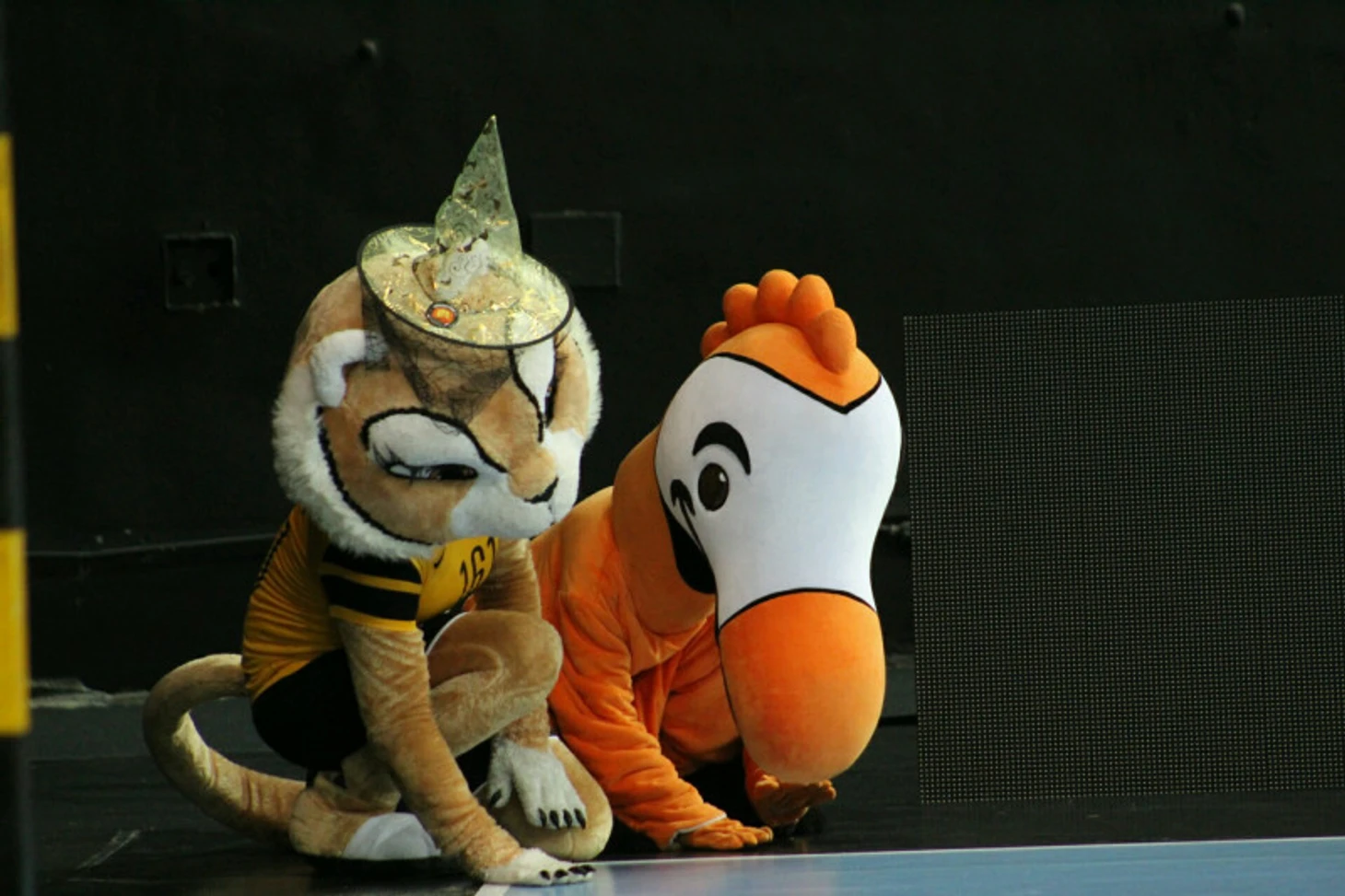 Маскот Викки ходила в хэллоунской шляпе. Она рассказала мне, что булавки для этого искали всем Дворцом спорта.