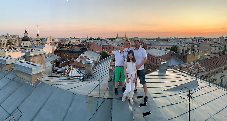 «Одной из последних тем у детей в школе на уроках истории была екатерининская эпоха, поэтому отправились на выходные в город на Неве. Мне кажется, именно здесь можно проникнуться духом императорской России. Но главные музеи Санкт-Петербурга были закрыты, мы с семьей решили просто погулять по городу. Посмотрели разные достопримечательности: скульптуру «Чижик-Пыжик», памятники котятам и кошкам, различные дворцы, каналы. За день проходили около 15 километров – можно сказать, что была хорошая кардиотренировка! (смеется) В Питере прекрасная архитектура, которую хочется рассмотреть с высоты. Поэтому мы отправились на экскурсию по крышам, где и была сделана фотография», - рассказал Левшин.