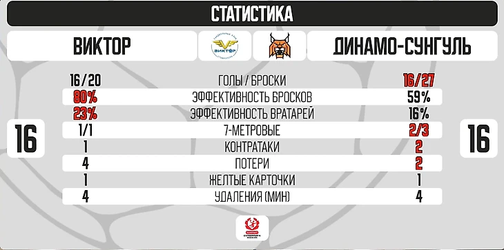По статистике, у «ВиктОра», по итогам тридцати минут, было преимущество по эффективности бросков и вратарей, а «Сунгуль» меньше терял мяч.
