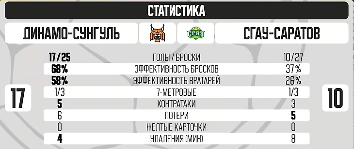 Не смотря на спасения Никабадзе, к 19-й минуте «Сунгуль» довел разрыв до семи мячей. Развивать разницу не позволял все тот же голкипер гостей, добавив еще несколько отражений в свою копилочку, включая броски с пенальти в исполнении «грозы» «Чеховских медведей» Павла Демакова и Александра Коваленко. Несколько ошибок со стороны хозяев дали шанс волжанам подобраться поближе, на расстояние в пять точных бросков. Тогда брать тайм-аут пришло время Дмитрия Карлова. Сработало - на перерыв команды ушли все при тех же плюс семи в пользу «Сунгуля». Посмотрите в цифры по итогам первого тайма – эффективность бросков выше у хозяев почти в два раза, а уж про Владислава Мартыненко и говорить то нечего -58% надежности. Просто феноменальные проценты.