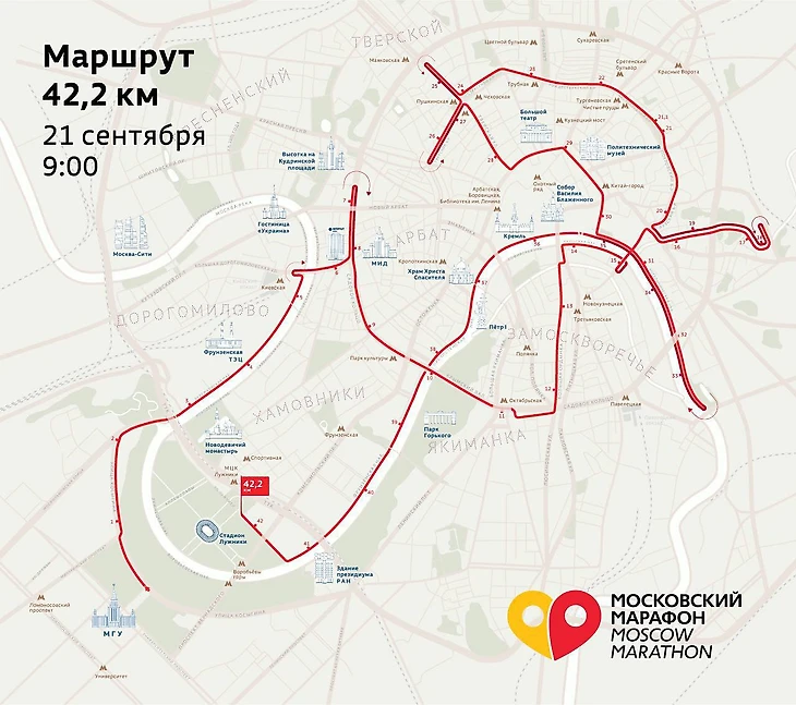 Старт в этом году пройдет на Университетской площади, возле МГУ, а финиш – на территории олимпийского комплекса «Лужники». Атлеты будут бежать по центру Москвы: по набережным Москвы-реки и Садовому и Бульварному кольцам мимо Кремля, Храма Христа Спасителя, сталинских высоток.