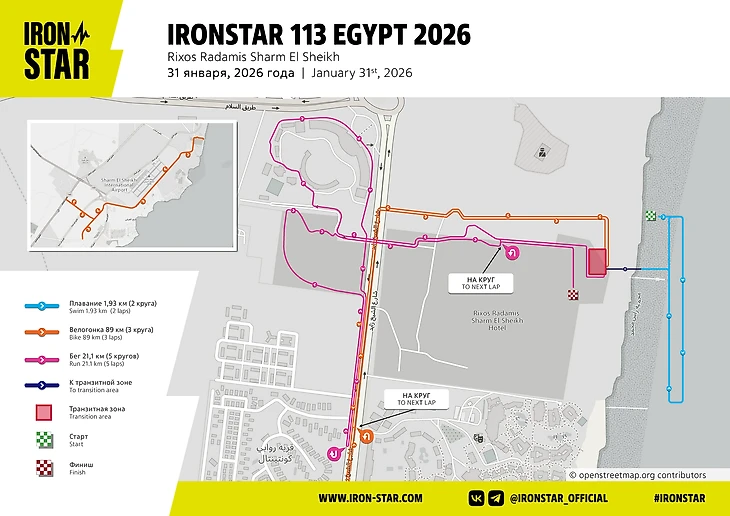 Плавание пройдет в акватории Красного моря (температура воды – около 20 градусов). Велоэтап состоится по широкой шестиполосной дороге, а бег – по территории отеля.