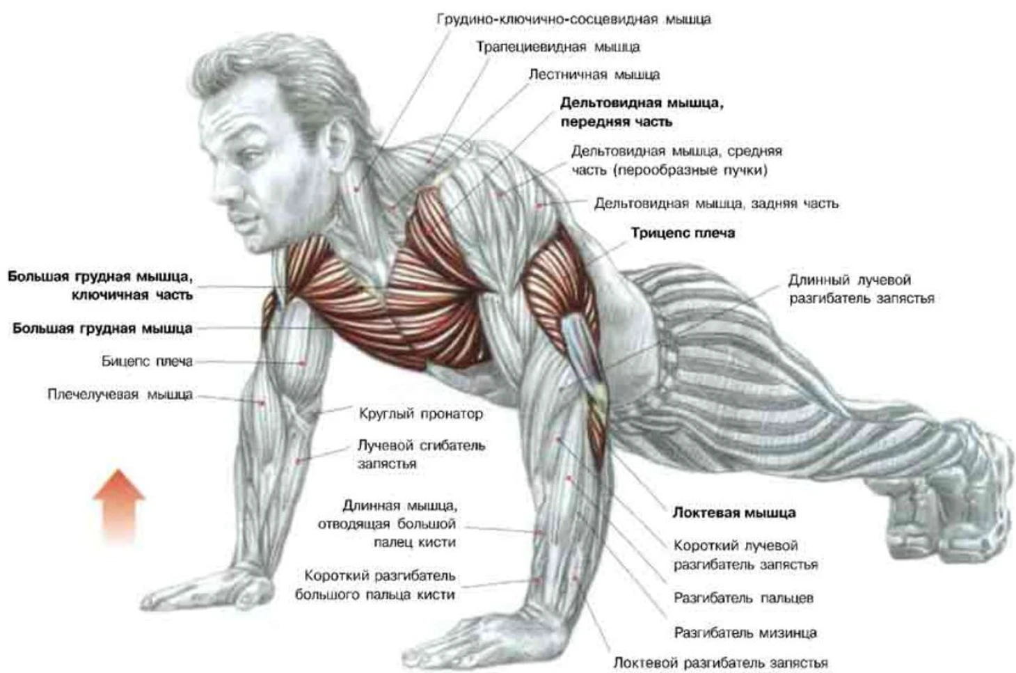 Должны работать все мышцы торса, большие и малые мышцы груди, дельтовидные мышцы и трицепс.