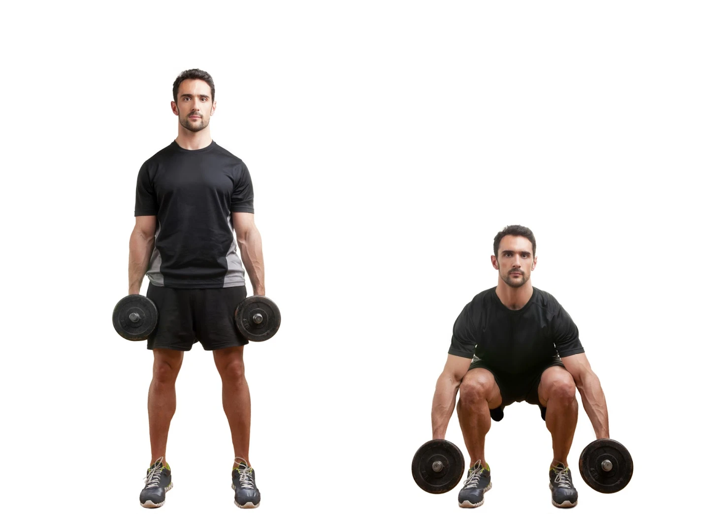 Отличное упражнение с гантелями для мышц ног. Возьмите снаряды, ноги расставьте на ширине плеч и начинайте приседать. На вдохе опускайтесь, пока бедра не будут параллельны поверхности пола. На выдохе вернитесь в исходное положение. Чем ниже будете приседать, тем большую нагрузку получат ягодицы. Число подходов — 3-5, повторов — 10-15.