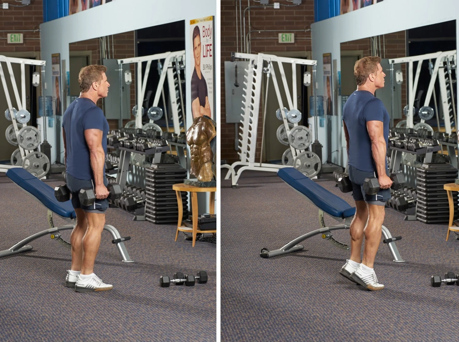 Встаньте прямо. Руки с гантелями опустите вдоль туловища. Медленно вытянитесь вверх, перенося вес тела на носочки, задержитесь в таком положении на несколько секунд. Вернитесь в исходную позу. Рекомендуемое число подходов от 3 до 5 по 10-15 раз.