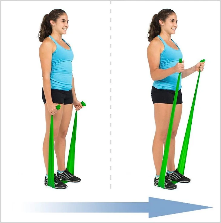Наступите обеими стопами на среднюю часть тренажера. Ноги при этом расставьте на ширине плеч. Возьмите края ленты-эспандера или намотайте их для удобства на запястья и ладони. Руки свободно вытяните вдоль туловище, натяжение в этот момент не должно быть слишком сильным. Теперь поднимите их вверх, сгибая в локтях и натягивая ленту.