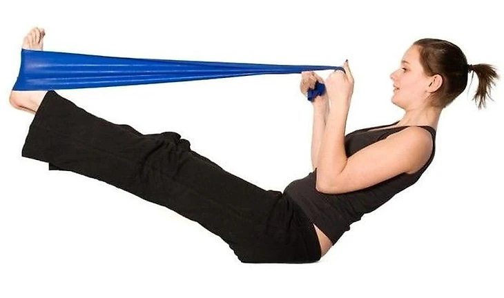 В положении лежа заведите центральную часть ленты за стопы. края снаряда крепко удерживайте в ладонях. Одновременно поднимите ноги и туловище примерно на 45 градусов от поверхности пола. Постарайтесь удержаться в этом положении несколько секунд. Вернитесь в начальную позу.