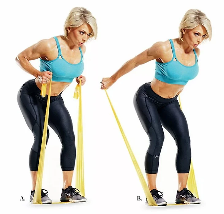 Края ленты намотайте на ладони или запястья, отрегулируйте натяжение. Выпрямите руки перед собой и следом потяните их в свою сторону (к поясу). При выполнении движения лопатки должны быть сведенными. Во время тяги локти старайтесь прижимать ближе к корпусу. Неспеша вернитесь в начальную позицию. Повторите это упражнение с помощью эластичной ленты 10-12 раз в 3 сета.