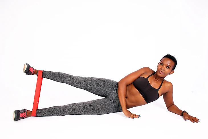 В первую очередь из эластичной ленты сделайте кольцо, связав края снаряда. Диаметр отрегулируйте в зависимости от нужного натяжения. Теперь примите позу лежа на полу на боку. Резиновый тренажер разместите на лодыжках, продев в него обе ноги. Обопритесь на локоть.