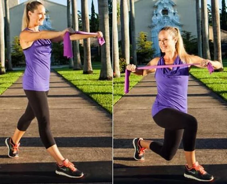 Встаньте прямо. Резиновую ленту сложите пополам и держите перед собой на вытянутых руках. Теперь согните локтевые суставы, как можно сильнее растягивая снаряд и подтяните их к груди. Одновременно с этим движением выступите правой ногой вперед и поверните корпус в этом же направлении. Левая конечной при этом удерживается на носках, не касается поверхности пола.