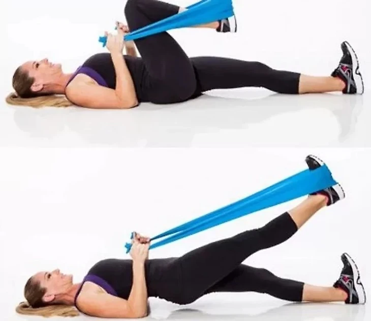 Лежа на полу, согните колени. Поднимите одну ногу и заведите за ступню центральную часть тренажера. Края снаряда удерживайте в руках или намотайте на ладони. Работая с длинных эспандером, можно сложить его вдвое.