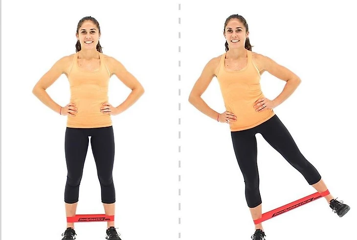 Растягивая эспандер, поднимите верхнюю ногу и вернитесь в исходную позицию. Повторите упражнение 15-20 раз на каждую конечность в 2-3 сета.